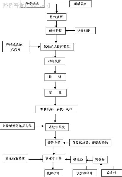 本合同段王家塘玉带河特大桥桥墩基础为钻孔灌注桩,桩径为Φ 1.5m。河床地质为卵石、砂砾岩。针对地质及现场条件,拟采用冲击钻机钻孔,汽车吊吊放钢筋笼,砼由拌合站集中拌和,砼输送车运输,导管法水下灌注砼。