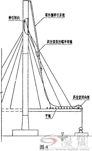 j.岸侧边跨合龙后,岸侧斜拉索上桥方案有两种:①从江侧前端上桥面,平拖至岸侧再向上牵引;②直接从岸侧钢箱梁路缘外侧上桥面。前一种方案在安徽铜陵大桥及黄山太平湖大桥都使用过,缺点是用时较长,还需多台卷扬机接力做桥面牵引。后一种方案首次在南京二桥实施成功,只需将原安装在梁前端的转向架改装在梁外侧,转向架向外挑出,牵引张拉端通过转向架时先让其完成竖直面转向,到达桥面,再使其完成水平转向,转而沿平行于桥轴线的路径向索塔根部牵引,其他环节施工过程则与上述内容相同,实践证明此方案较前一种更省时、高效。