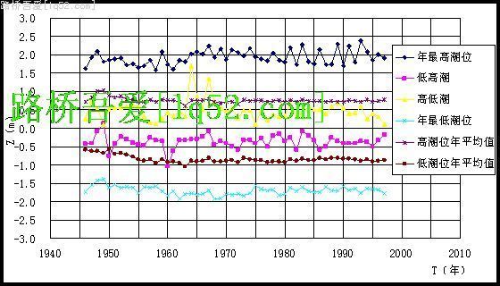 珠江河口的潮汐为不规则半日潮,在一个太阴日内两涨两落,且两次高低潮位和潮差各不相同,涨落潮历时亦不相等。纳潮量的大小反映潮汐动力的强弱,因纳潮量大小主要由潮差和纳潮面积组成的潮棱体体积决定,珠江干流出海航道的潮流动力自口门往上游逐渐减少。根据实测资料,口门内大虎站单潮最大纳潮量约5.47亿m3,至桥区附近黄埔电厂单潮最大纳潮量减至6060万m3,最大涨、落潮流量分别由大虎站42500m3/s和34300m3/s减至黄埔电厂位置4775m3/s和3675m3/s,最大涨、落潮流速分别由大虎站1.12m/s和1.01m/s减至黄埔电厂0.75 m/s和0.71m/s。经相关推算,拟建桥位附近年纳潮总量254亿m3,其山潮比为0.96仍略小于1,反映潮流整体强于径流。黄埔特征潮位历年变化见图1,实测最高潮水位为2.38m,最低潮水位为-1.93m,高潮位平均值0.73m,低潮位平均值-0.89m。