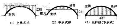 在竖直荷载作用下,作为承重结构的拱肋主要承受压力。拱桥的支座则不但要承受竖直方向的力,还要承受水平方向的力。因此拱桥对基础与地基的要求比梁桥要高。下图分别表示上承式拱桥(桥面在拱肋的上方)、中承式拱桥(桥面一部分在拱肋上方,一部分在拱助下方)与下承式拱桥(桥面在拱肋下方)。仅供人、言行走的拱桥可以把桥面直接铺在拱肋上。而通行现代交通工具的拱桥,桥面必须保持一定的平直度,不能直接铺在曲线形的拱肋上,因此要通过立柱或吊杆将桥面间接支承在拱肋上。