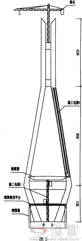 施工电梯是主塔斜拉索施工时工作人员上、下的主要交通工具。1台施工电梯,布置在桥轴线上索塔的江侧,距主塔横轴线6m处,施工电梯从钢围堰顶面平台到钢箱梁底面施工平台,其输送高度为23m,每8m设置一个附墙。另一台电梯安装在索塔下游塔肢中塔柱空腔内,从下横梁项面直到中横梁底面,其输送高度为87m,电梯的安装斜度与中塔柱的斜度保持一致,附墙与电梯预埋件相联。此外,在上塔柱内设置脚手架通道及斜拉索张拉平台,见布置图2。