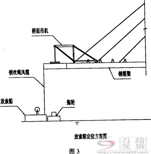 斜拉索运送到施工水域后,按编号转移到放索船的放索架上,在钢箱梁的环焊缝焊接完成后,用120匹马力拖轮把放索船顶推到主梁端部的正下方,放索船的长度方向与主梁横断面方向一致,这时,从钢箱梁前端的上、下游各放一根φ9.5mm卷扬机钢丝绳,拴住放索船内侧上下游的拉环,启动卷扬机,使钢丝绳受力适中,同时利用拖轮调整放索船的平面位置,通过目测,保持放索架上斜拉索转盘处钢箱梁前端的斜拉索转向架的正下方。此时,放索船定位完毕。见放索船定位方案图3。