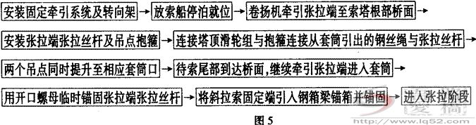 整个挂索过程粗略可分为两个阶段:①牵弓提升,使整根拉索脱离索盘;将两个冷铸锚头分别灌入索塔及箱梁的预定锚固孔道,并固定;②张拉至设计吨位,并根据主梁悬壁端荷载及标高适当调整索力。