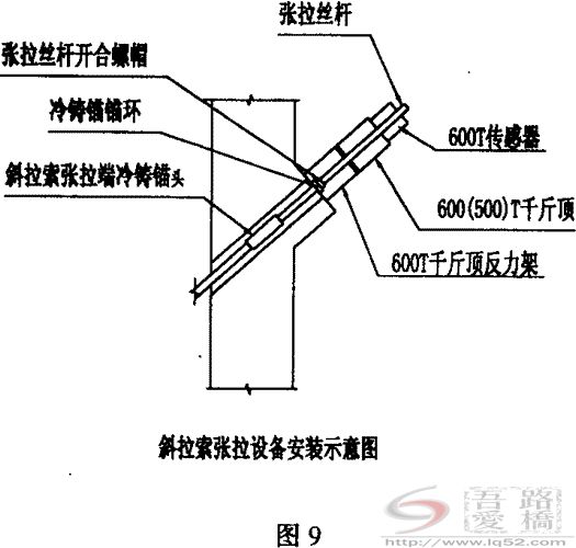 南京二桥斜拉索的最小张拉吨位为180t,最大张拉吨位为460t。采取一端张拉,一端锚固的张拉方式,即事先把斜拉索下端冷铸锚锚固在箱梁上,张拉在索塔内进行。根据施工单位现有设备,以及最大张拉力不超过千斤顶容许荷载的 95%的施工规范,张拉千斤顶采用YDC-500型和LS-600型千斤顶,油压表采用0.4级精度表。在索塔内张拉空间足够的情况下,在张拉丝杆上配有精度为 0.5%的 600t传感器进行检验,保证索力准确。见张拉安装图9。