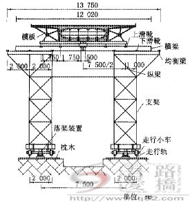 地面轨道走行式造桥机主要由走行系统、地面移动支架、支顶设备、模板系统组成,见图1。