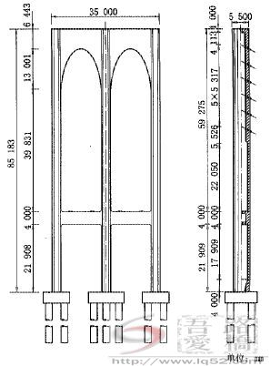 主塔柱顺桥向自上而下等宽,宽度为5.5m,横桥向均为3m。塔柱截面采用单箱单室。下横梁为单箱单室截面,高4.0m,宽4.0m,为了适应横梁端部受力需要,在横梁与塔柱交接处对横梁截面进行了局部加强。上横梁为单箱单室截面,横桥向梁底设椭圆线形。上、下横梁均为全预应力构件。斜拉索直接锚固于塔柱内壁的锯齿块上,为了平衡斜索在塔柱截面产生拉力,在塔柱四周均布置有后张预应力筋。