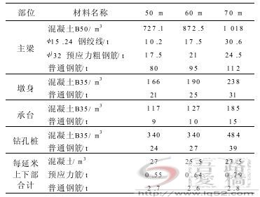 在引桥设计中,分别对50,60,70m三种跨径的混凝土连续梁作了全面比较,见表1。换算每延米工程材料用量进行比较并考虑施工难易程度,60m梁跨比较合适,因此本桥引桥跨径确定为60m。