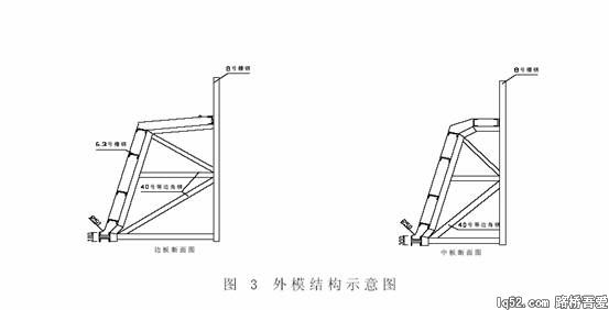 外模采用组合式钢模,由厂家统一加工制作,同时为保证箱梁外观质量,外模采用5mm钢板加工而成,其支架为槽钢和角钢。共分4 节,每节长度6.235m,每节加工形状与箱梁外部尺寸相吻合,单片模板结构如图3 所示。
