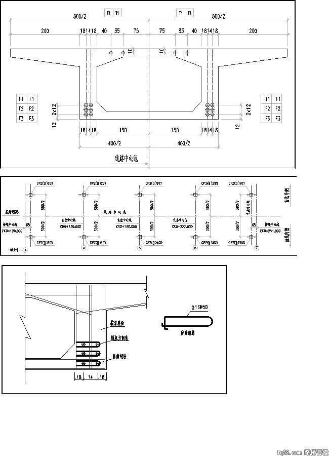 2. 箱梁采用单向预应力体系。纵向预应力筋采用高强度低松弛钢绞线(12-7ф5及7-7ф5),钢束均为一端张拉。(箱梁跨中预应力钢束布置见图一)